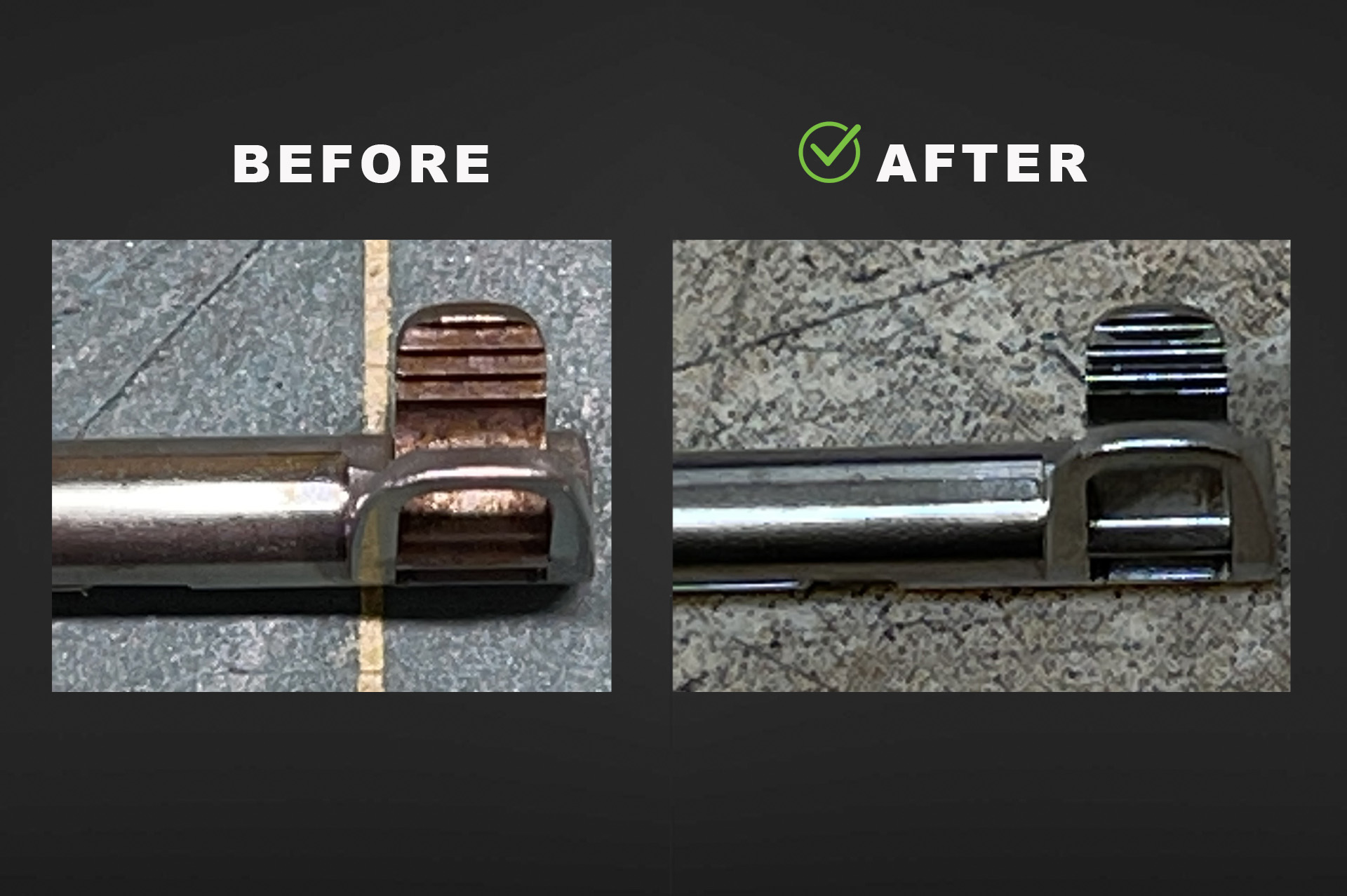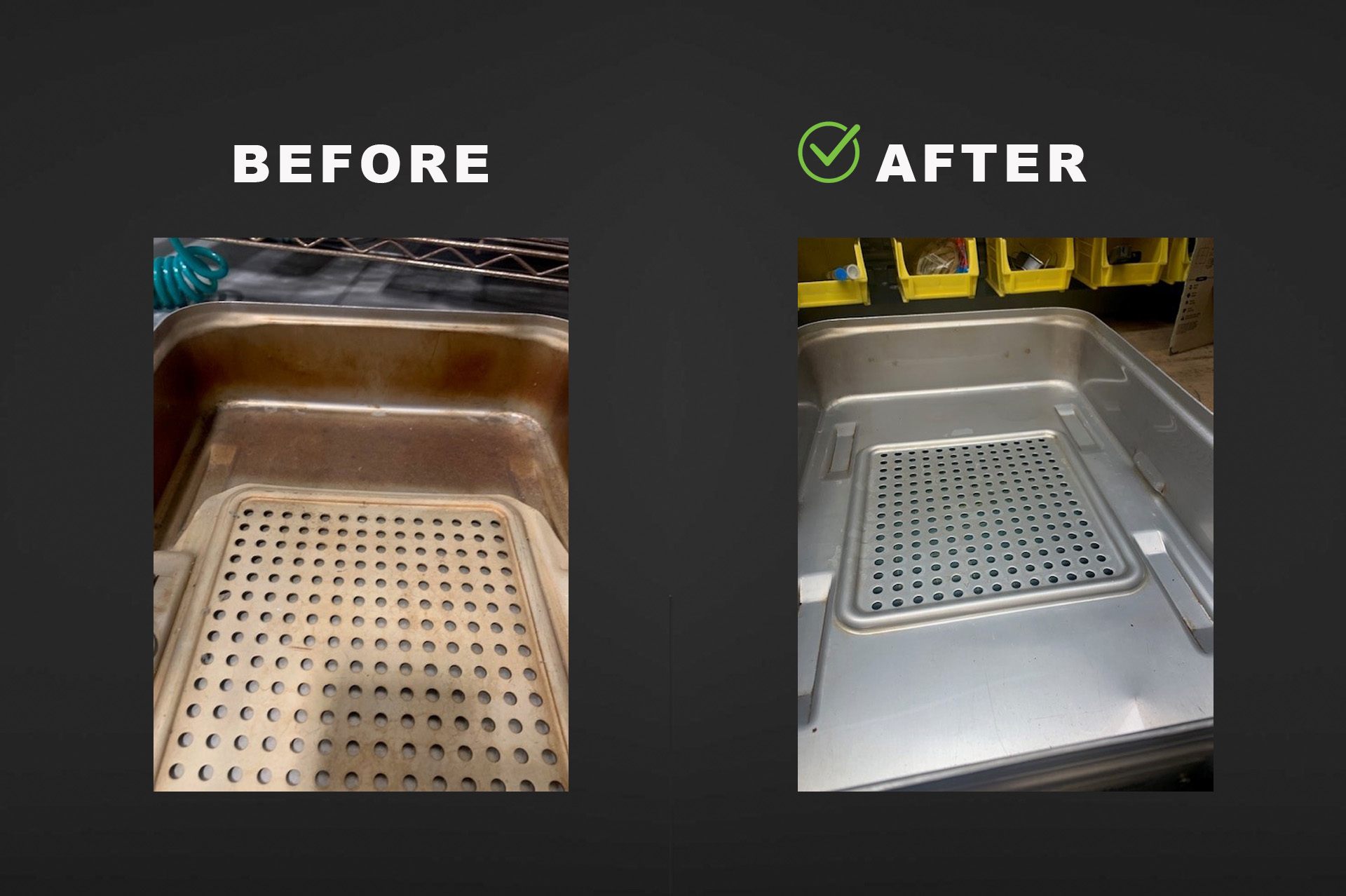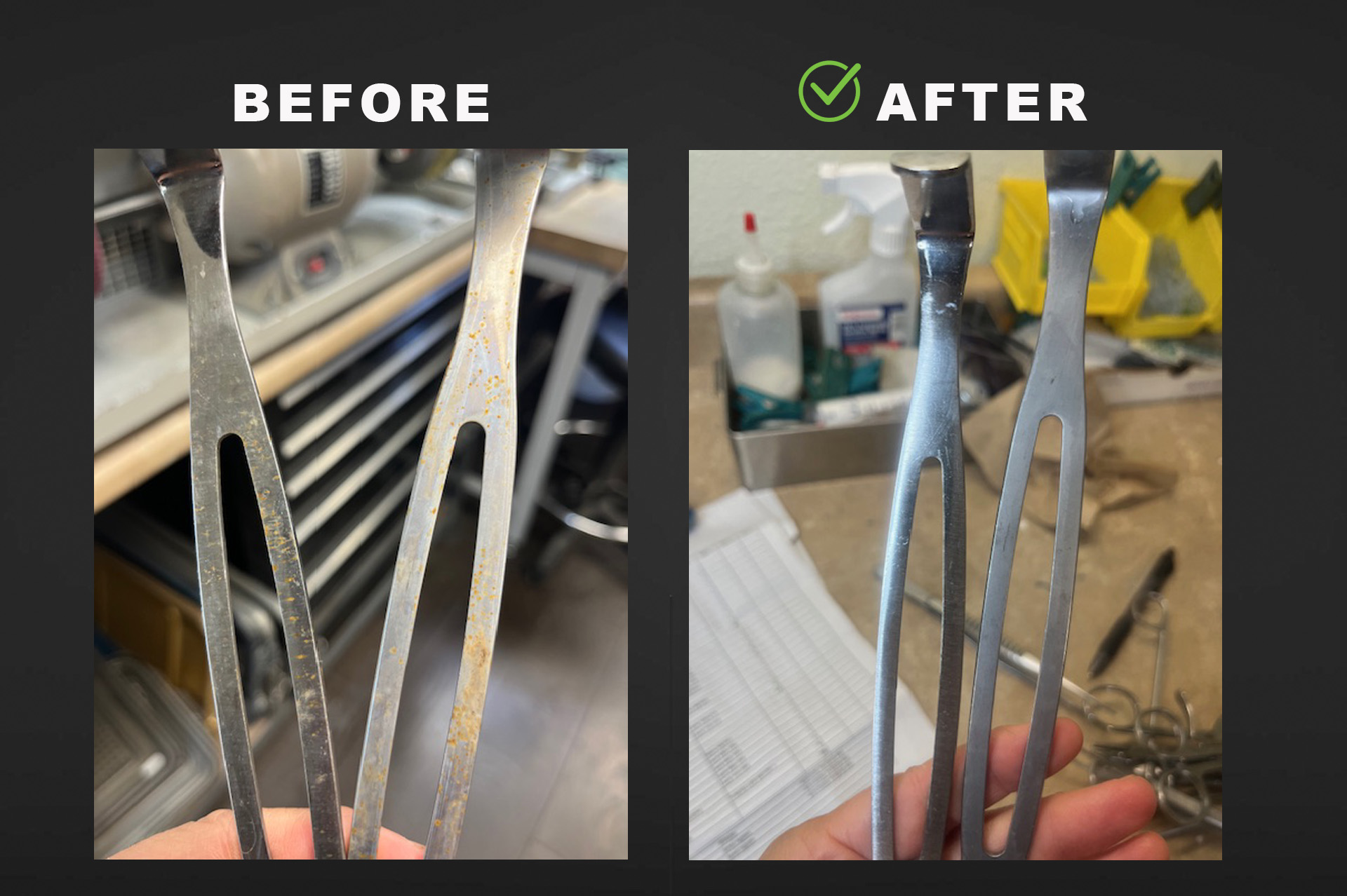 Non-corrosive treatment eliminating rust and stains, restoring instruments' appearance and functionality while preventing further degradation.