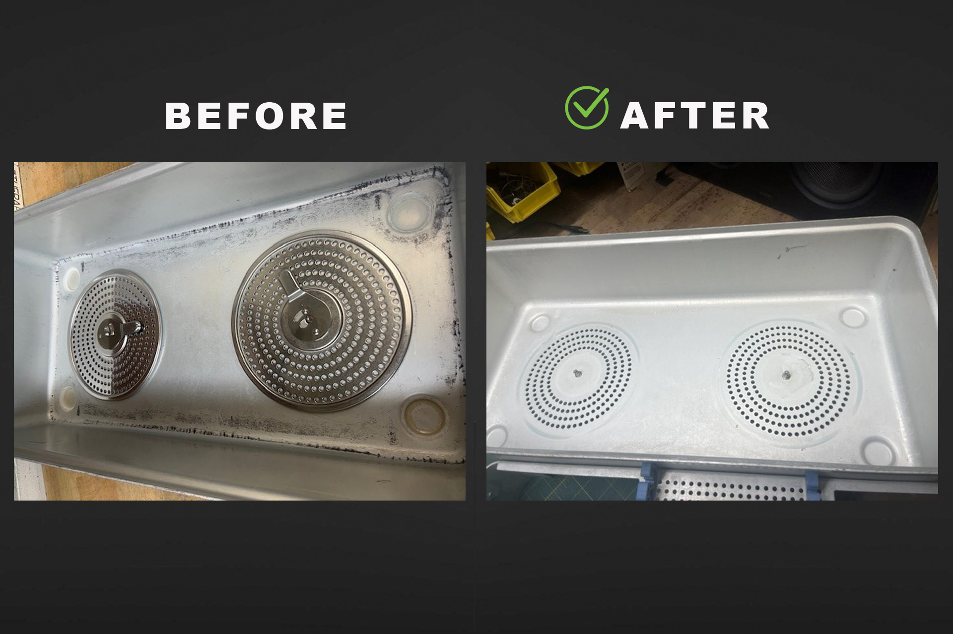 Restoration of aluminum sterilization containers, addressing dents and structural issues to ensure secure and effective instrument storage.